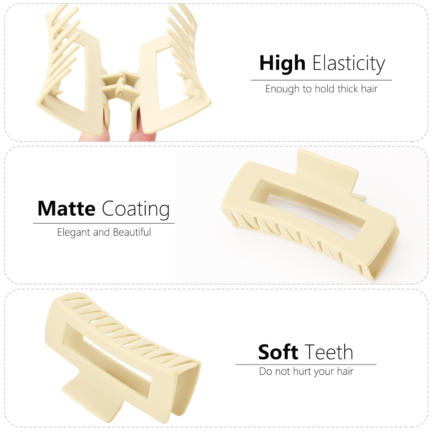 - DURABLE:These jumbo hair claws are made of durable plastic which painted with a matte paint. The paint doesn't scuff, peel .The reliable spring is strong andThe clips open almost 180 degrees versus which enough to help keep your hair in placeand whether dry or wet! The teeth and long enough that the keep a good grasp.They are the perfect durable material without feeling too heavy.Great for thick hair, curly or straight!!