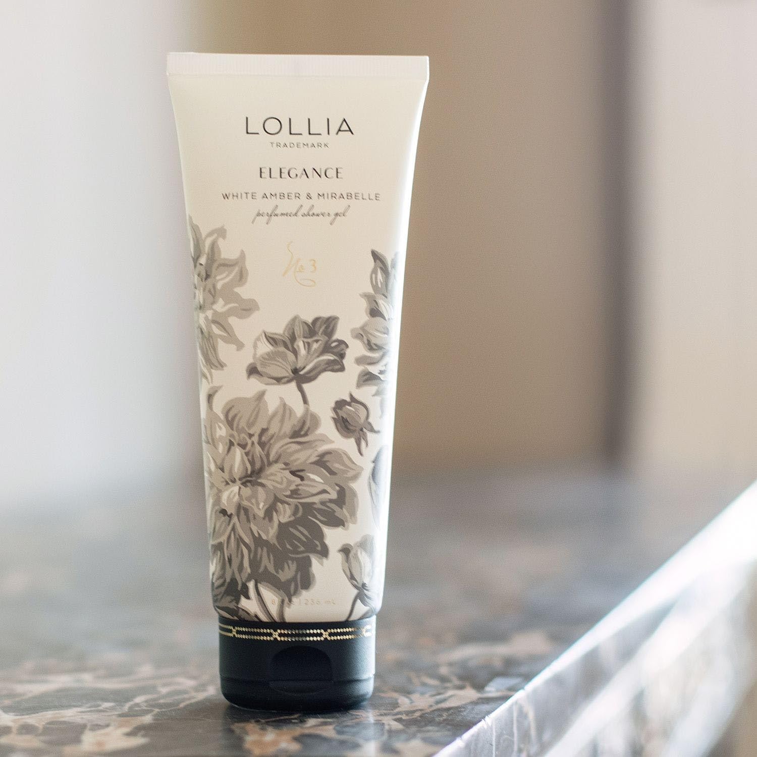 - WHITE AMBER & MIRABELLE: Lollia Elegance Shower Gel creates a luxurious lather with hydrating ingredients that condition and cleanse. The body soap is perfumed with delicate notes of White Amber and Mirabelle that leaves the skin beautifully scented.