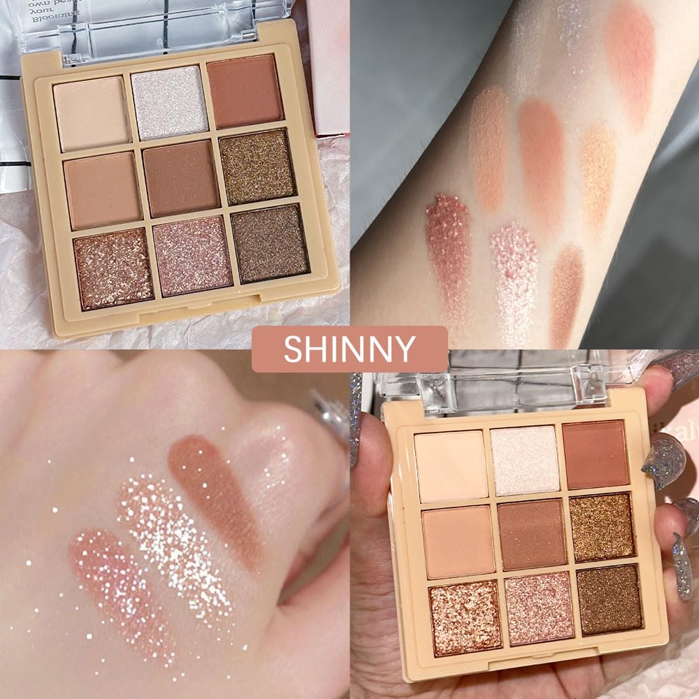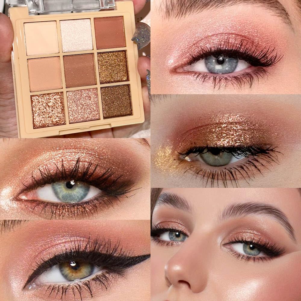9Colors Nude Champagne Gold Rose Brown Colorful Glitter Eyeshadow Palette Makeup,Korean Natural Neutral Rainbow Eyeshadow Palettes Naturing-Looking Long Lasting Waterproof Blendable
