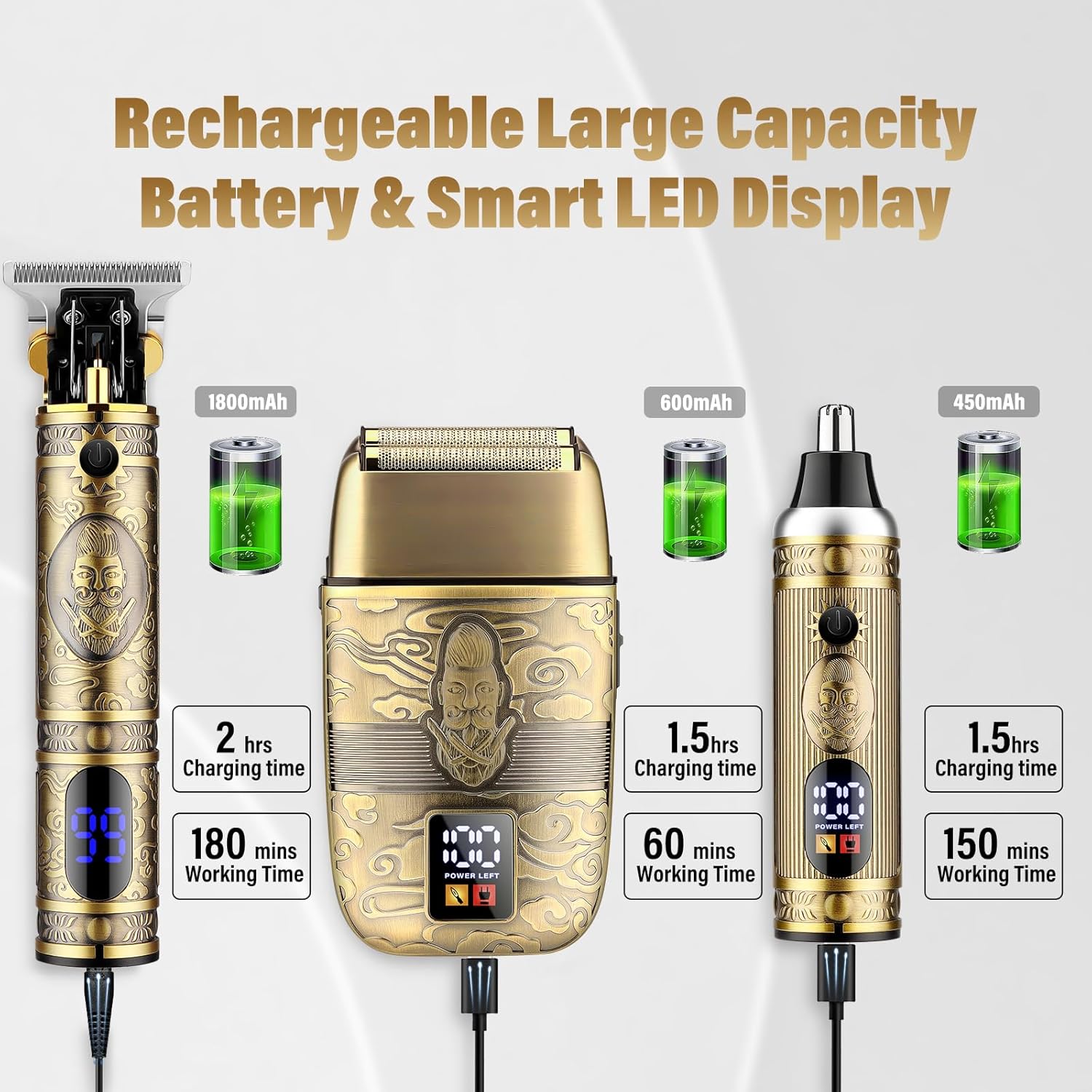 - Smart LED Display and Large Capacity Battery : The smart LED screen clearly displays the percentage of remaining power, reminding to charge and reminding to clean.Our trimmers have a built-in 1800 mAh high capacity battery,if you charge it for 2 hours and can use it for 180 minutes.Nose Trimmer can trimming 150 minutes after for 1.5 hrs charging.This man's razor is suitable for home, travel, business or barbershop use