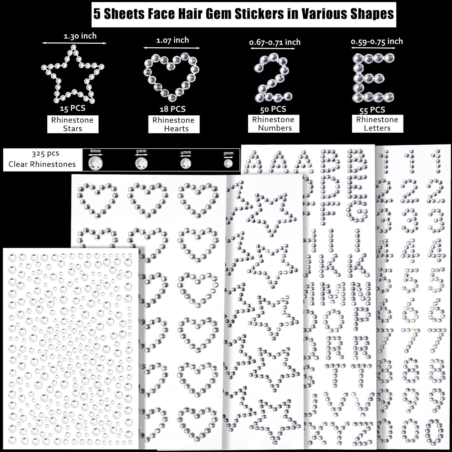 - ✮ HAIR FACE STICKERS COLLECTION - Package includes 5 sheets bling face rhinestones stickers, including 1 heart-shaped, 1star-shaped, 1 English letters and 1 numbers (138pcs in total), and also come with 325 pieces of round stick on face gems in 4 different sizes, which can be used for DIY decoration of other shapes.