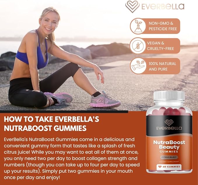 - BEST VEGAN COLLAGEN BOOSTER: EverBella NutraBoost Gummies use premium vegan ingredients to naturally boost your body’s collagen & elastin production. Perfect for anyone who wants to fade the appearance of wrinkles & fine lines, or grow stronger hair and nails. Sugar free.