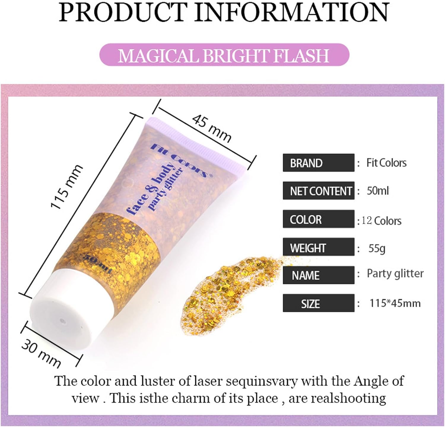 - Multiple Colors Holographic Glitter Gel --- Our Sparkly body glitter are rich in many colors.This face glitter gel is made of holographic glitter, contains 50ml glitter gel, which is light and durable. Large number of holographic sequins, the color and shine of the laser sequins vary with the perspective, like a rainbow