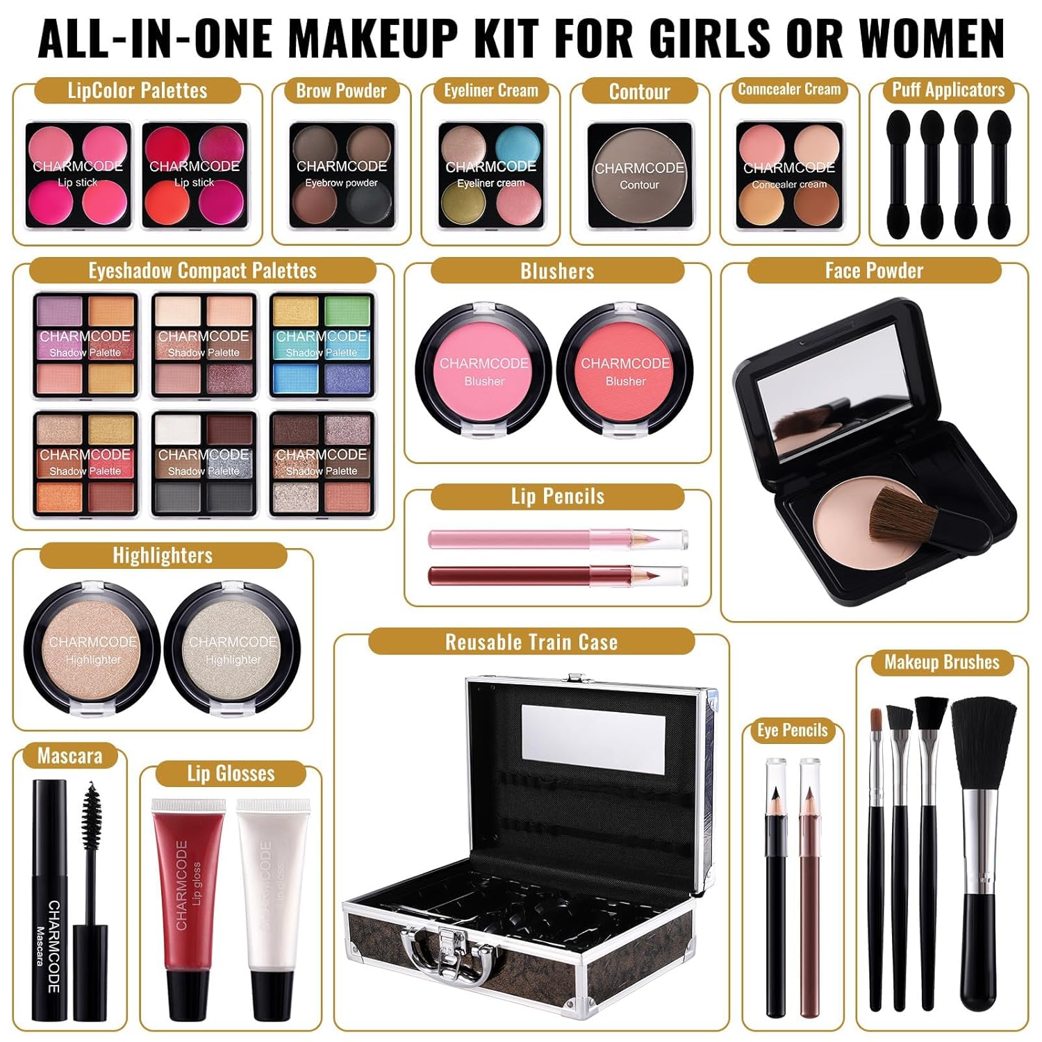 - 【What You Will Get】CHARMCODE trendy makeup sets includes 2 Eye Pencils, 2 Lip Pencils, 1 Mascara, 1 Face Powder Compact, , 4 Puff Applicators, 4 Brushes, 6 Eyeshadow Compact Palettes, 2 Blushes, 2 Highlighters, 1 Contour, 2 Lip Colors Compact Palettes, , 1 Brow Powder Compact, 1 Cream Eyeshadow Compact, 1 Cream Concealer Compact, 2 Tubes of Lip Cream Gels, 1 Reusable Aluminum Case and 1 Attached Mirror.