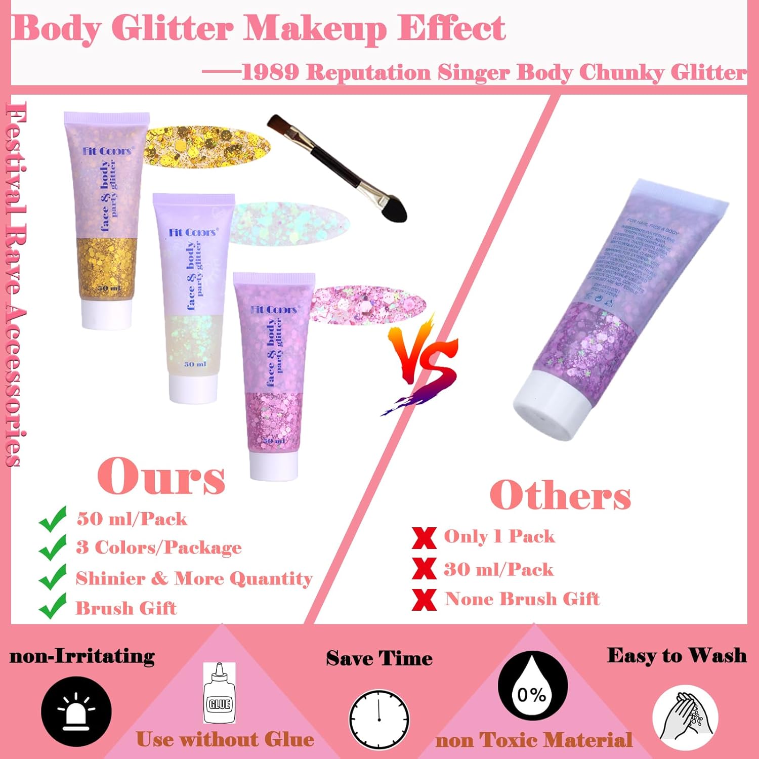 - Easy to Use and Remove: 1989 reputation singer face body Chunky Glitter is a glitter body gel that is sticky,Body glitter gel no need to use glue when using it, you can apply glitter gel to hair and body with fingertips or brush we match, save your makeup time.It can be used directly on the skin wherever you want to decorate,it will be dry for a moment, and will last all day. You can wash the body glitter easily through the water and soap.