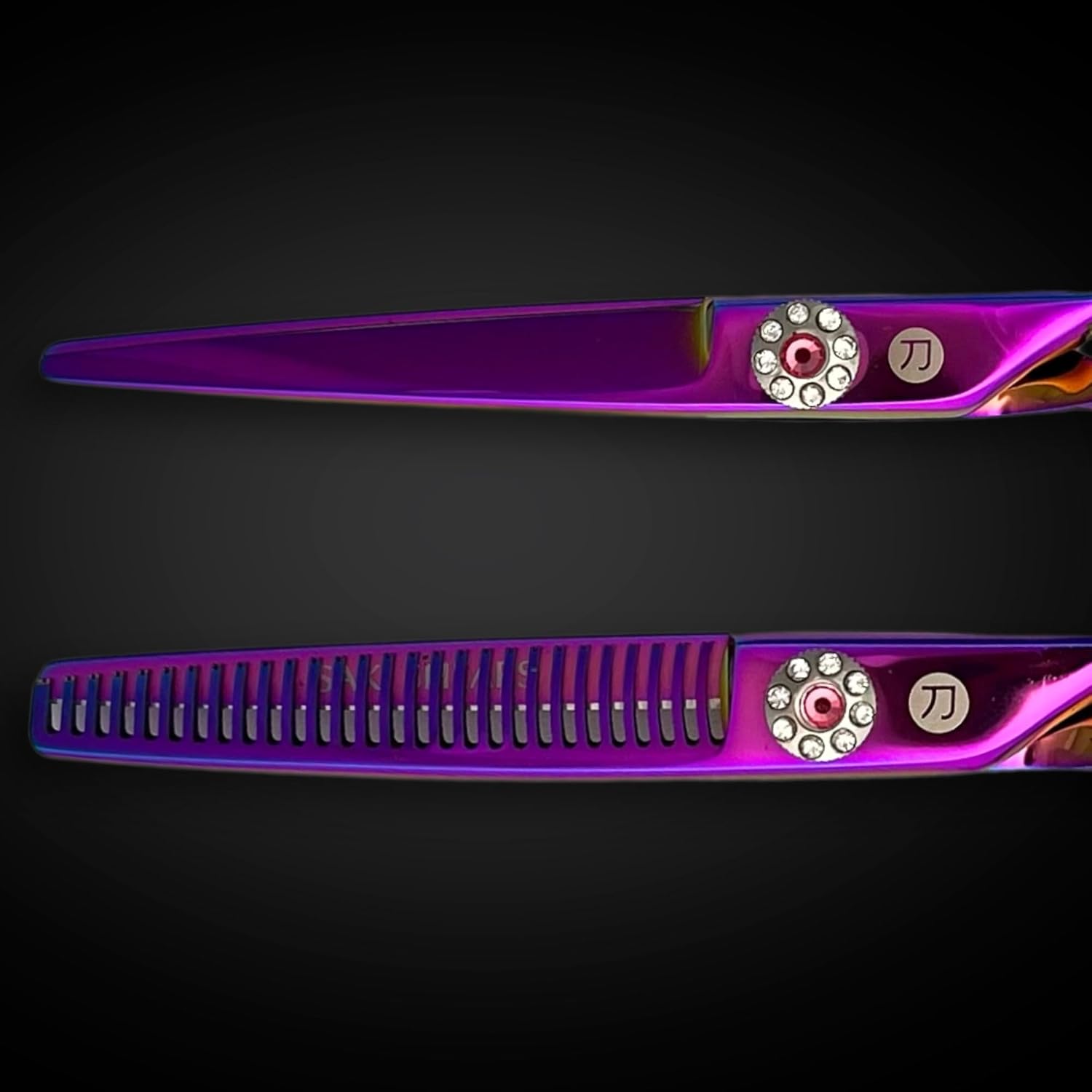 - Pink Swivel Thinning Shears: 5.5" with a swivel thumb design. Constructed from 440C steel.