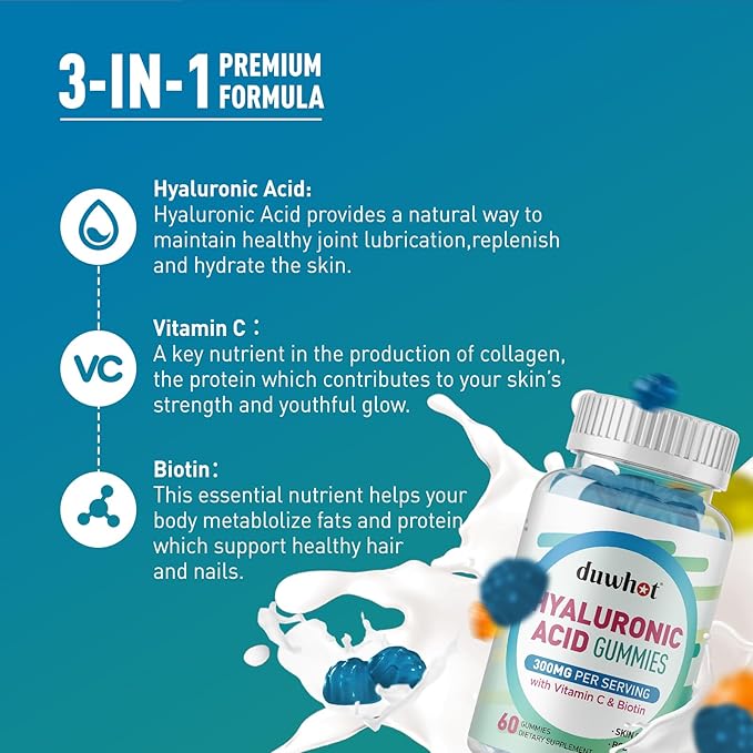 - 3-in-1 Hyaluronic Acid Gummies: Get your daily hyaluronic acid in a delicious and convenient way with our chewable hyaluronic acid supplements. Each serving is packed with vitamin C & biotin