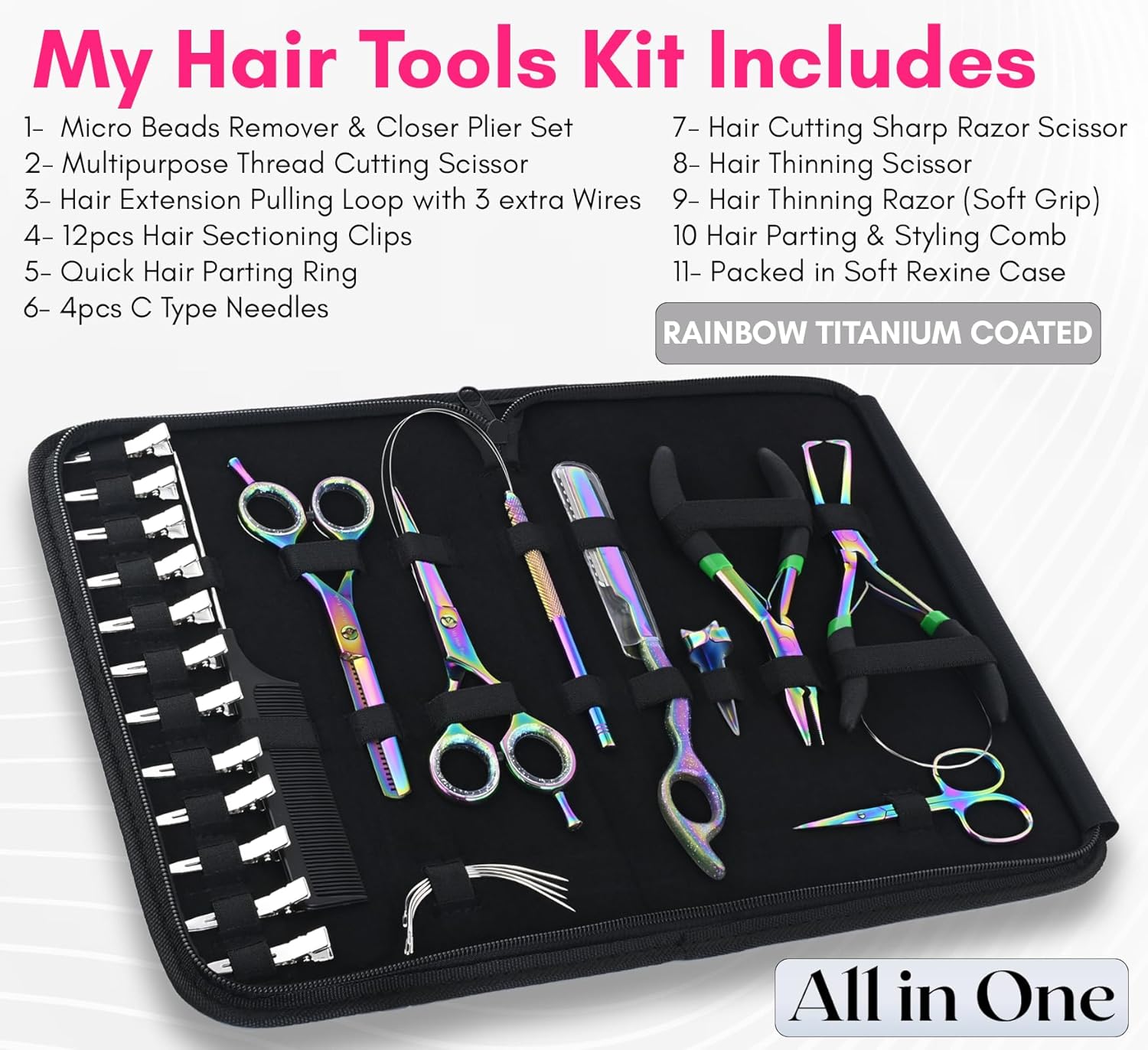 - Install Hair Extensions Like a Pro! My Hair Tools All in one Pro Hair Extension Tools kit Include 1pc Hair Extenion Remover & Micro Beads Crimping Plier, Hair Cutting & Styling Scissor Set, Hair Parting Tool, Hair Thinning Razor, Hair Loop Tool with 3 extra wires, 4pcs C Type Needles, Sectioning & Styling Clips & Multipurpose Scissor packed in case.