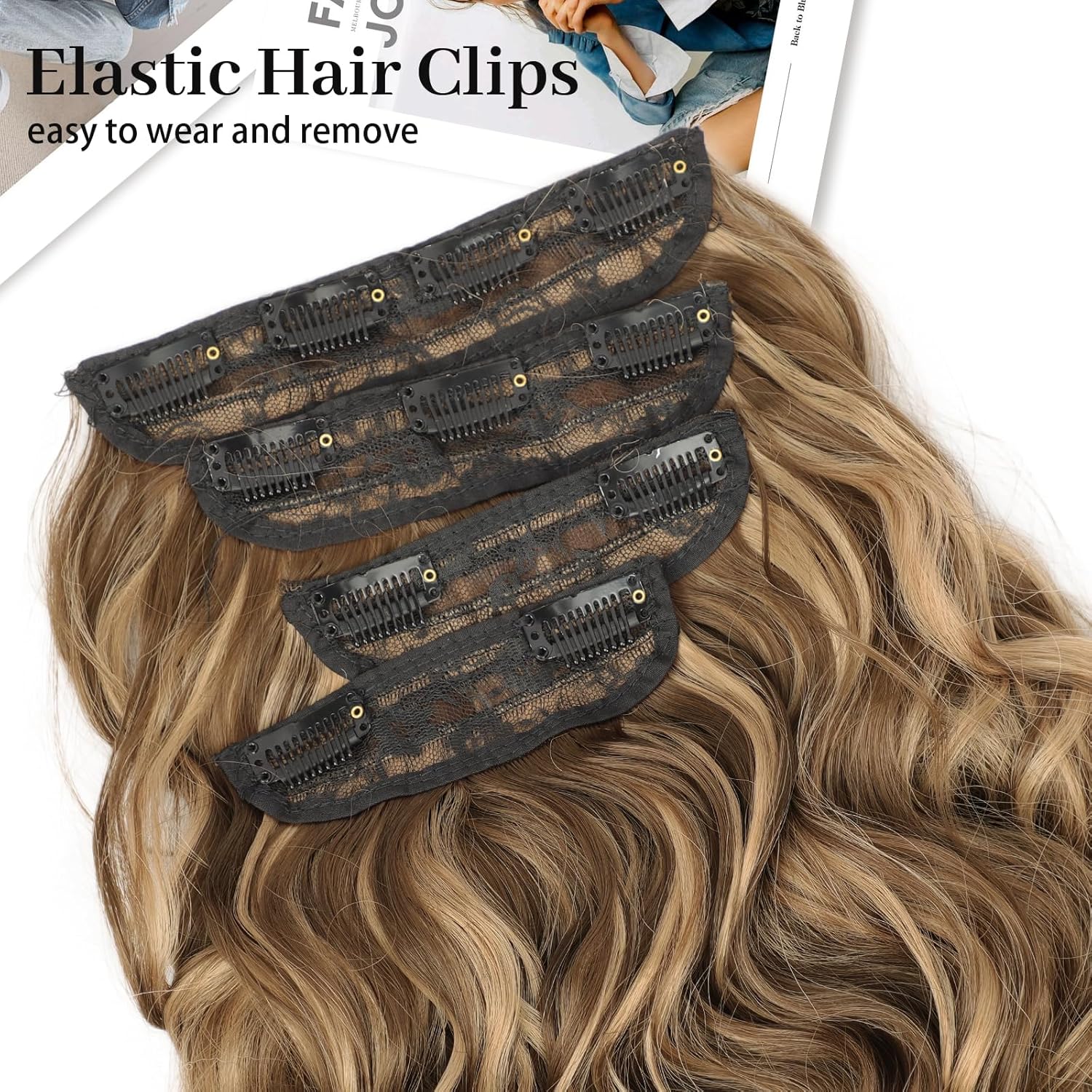 KooKaStyle Hair Extensions Medium Brown mix Caramel Blonde Clip in Synthetic Highlight Hair Extensions Long Wavy 4PCS Thick Hairpieces 20 Inch for Women
