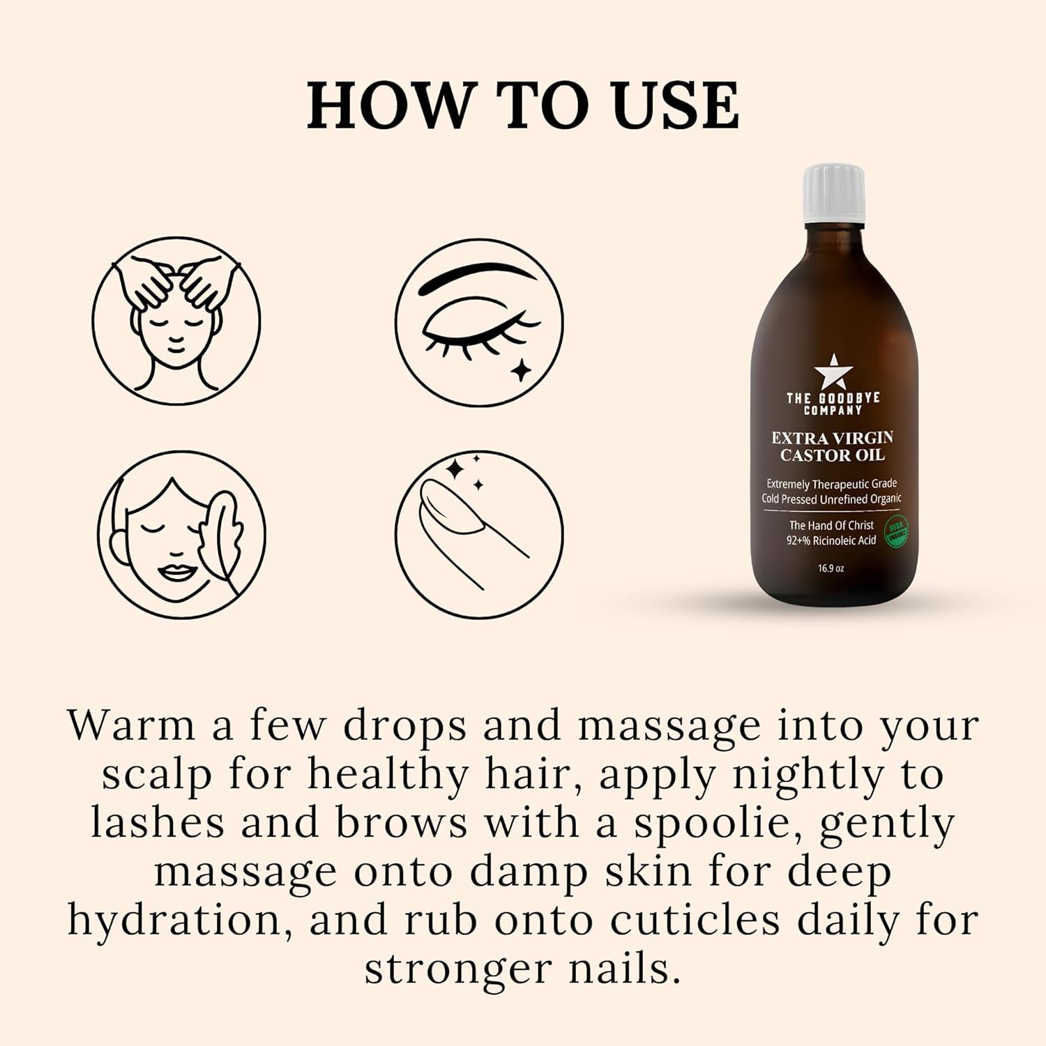 Premium Organic Cold-Pressed Castor Oil - 16.9 oz Glass Bottle, Hexane-Free, Small Batch, Extra Virgin, Ethically Sourced for Hair Growth, Skin Care, Lashes, Brows & Castor Oil Packs