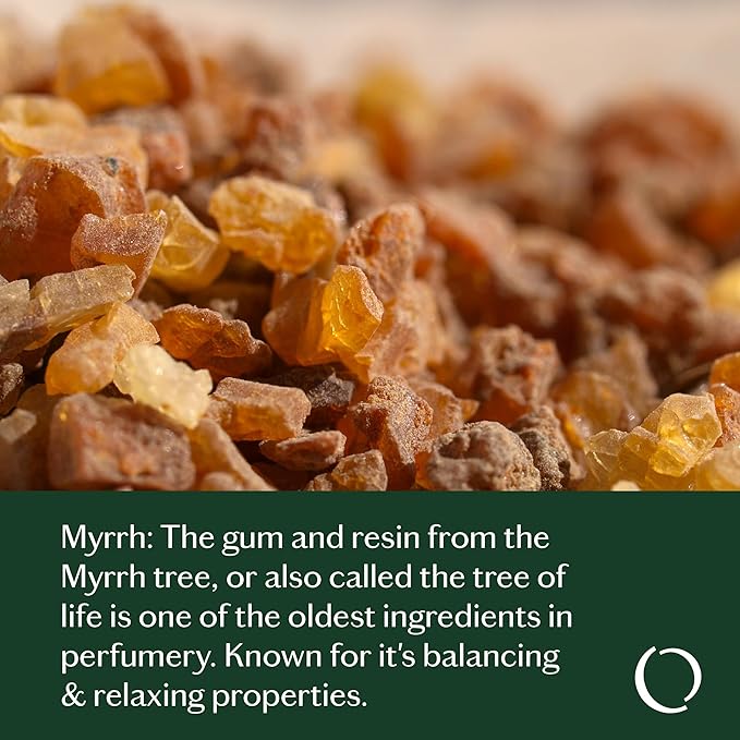 - Myrhh (Commiphora Myrrha): A rich, resinous oil extract from East Africa with a warm & rich scent. Myrrh is known for it's balancing & relaxing properties. Traditionally used in rituals, skincare.