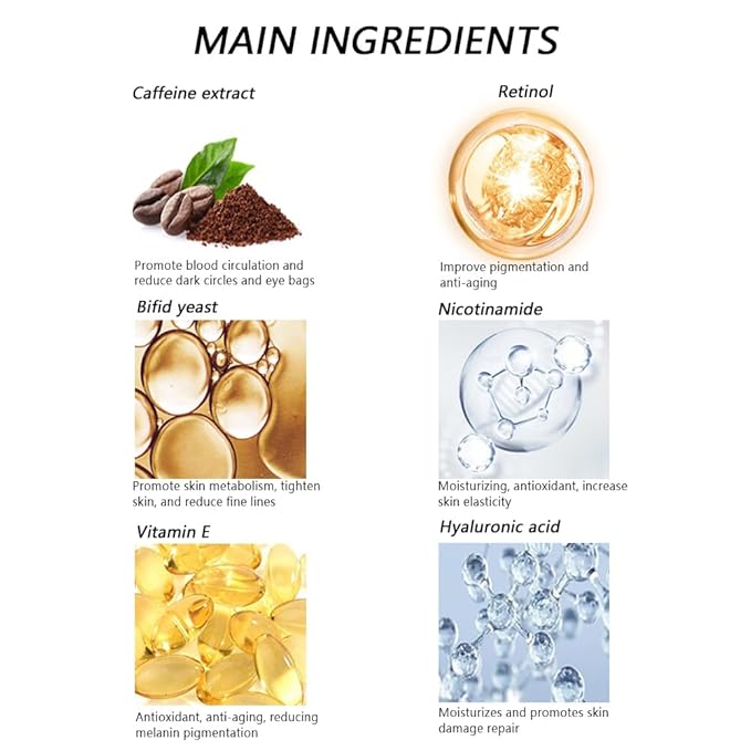 - Caffeine: Caffeine Eye Serum is a hydrating and de-puffing eye treatment that helps reduce the appearance of dark circles and puffiness around the eyes. Caffeine Eye Serum contains caffeine along with hyaluronic acid and vitamin E to hydrate and nourish the under-eye area, making it ideal eye care.