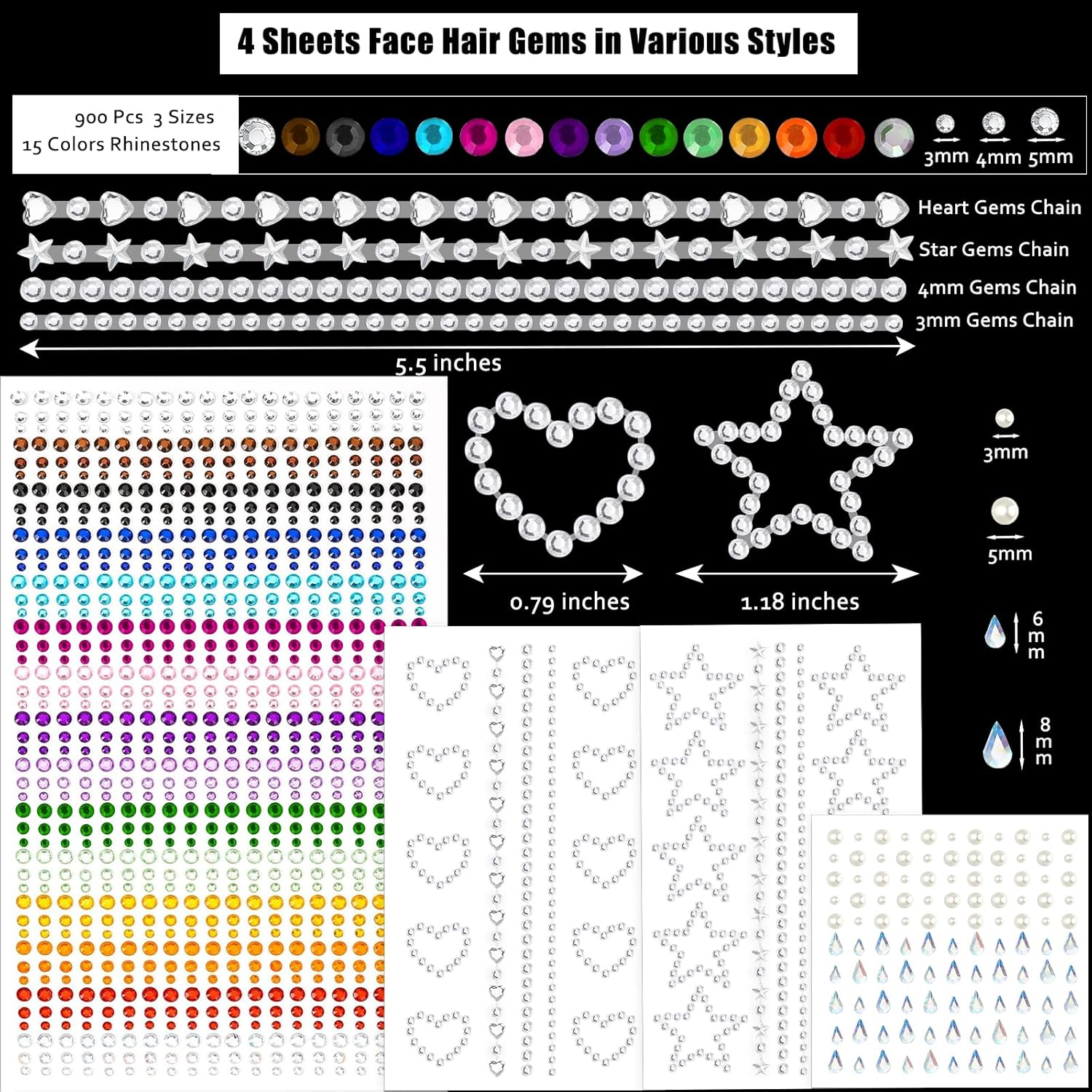 - GREAT AMOUNT & MULTI SHAPES HAIR STICKERS: 900 pcs rhinestones in 15 colors with 3 sizes: 3/4/5mm, 15 pcs clear rhinestones with 4 shapes: hearts and chains, 13 pcs clear rhinestones with 4 shapes: stars and chains, 110 pcs tear-shaped holo gems and pearls in 2 sizes:3/5mm. You will receive 1038 pcs of face hair rhinestones in total. Quiet enough to meet your different needs.