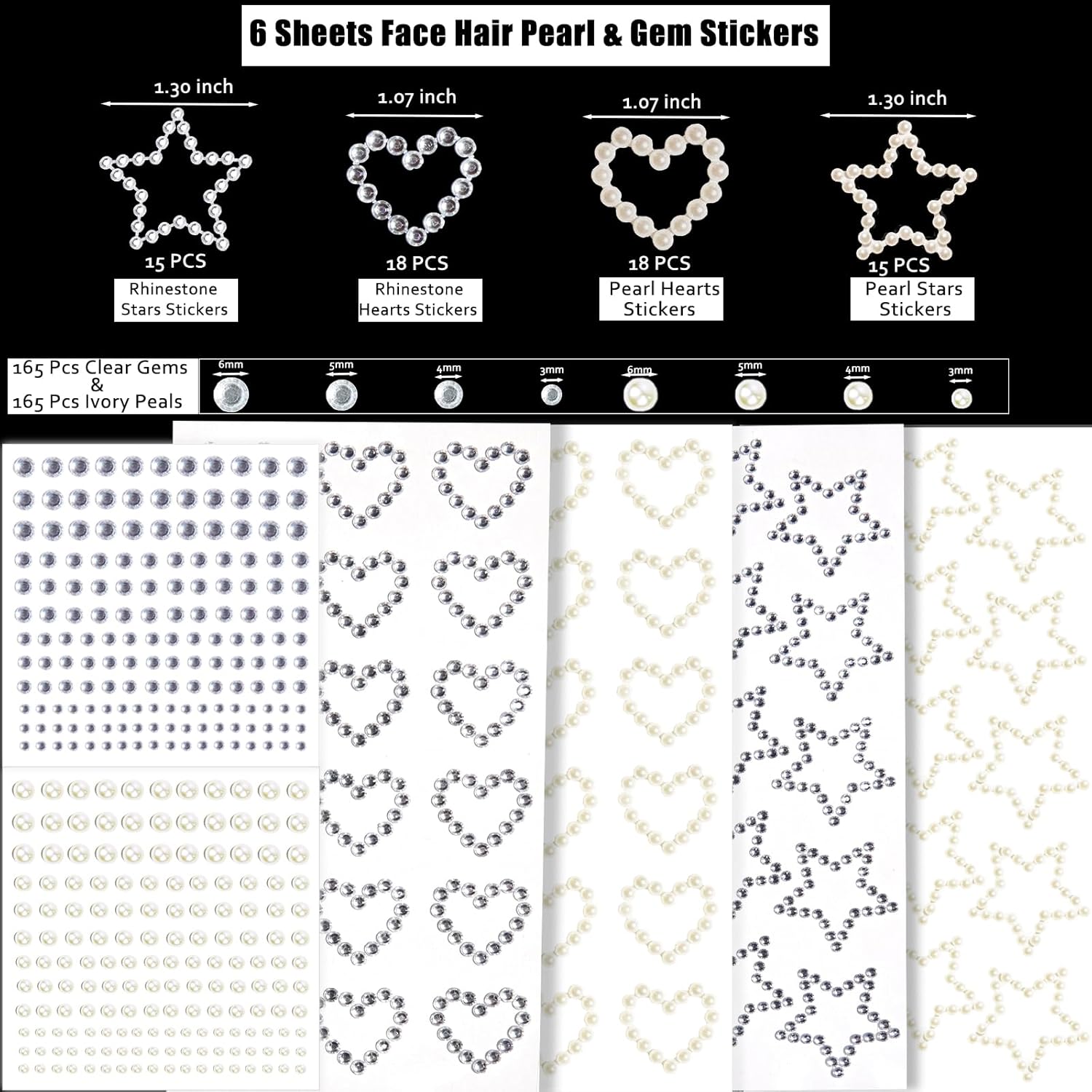 - HAIR FACE PEARLS GMES STICKERS COLLECTION:Package includes 6 sheets bling face rhinestones pearls stickers, including 1 heart-shaped rhinestones stickers , 1 star-shaped gems stickers,1 heart-shaped pearl stickers and 1 star-shaped pearl stickers, and also come with 1 sheet of round clear stick on face gems and 1 sheet of hair pearls in 3 different sizes, which can be used for DIY decoration of other shapes.