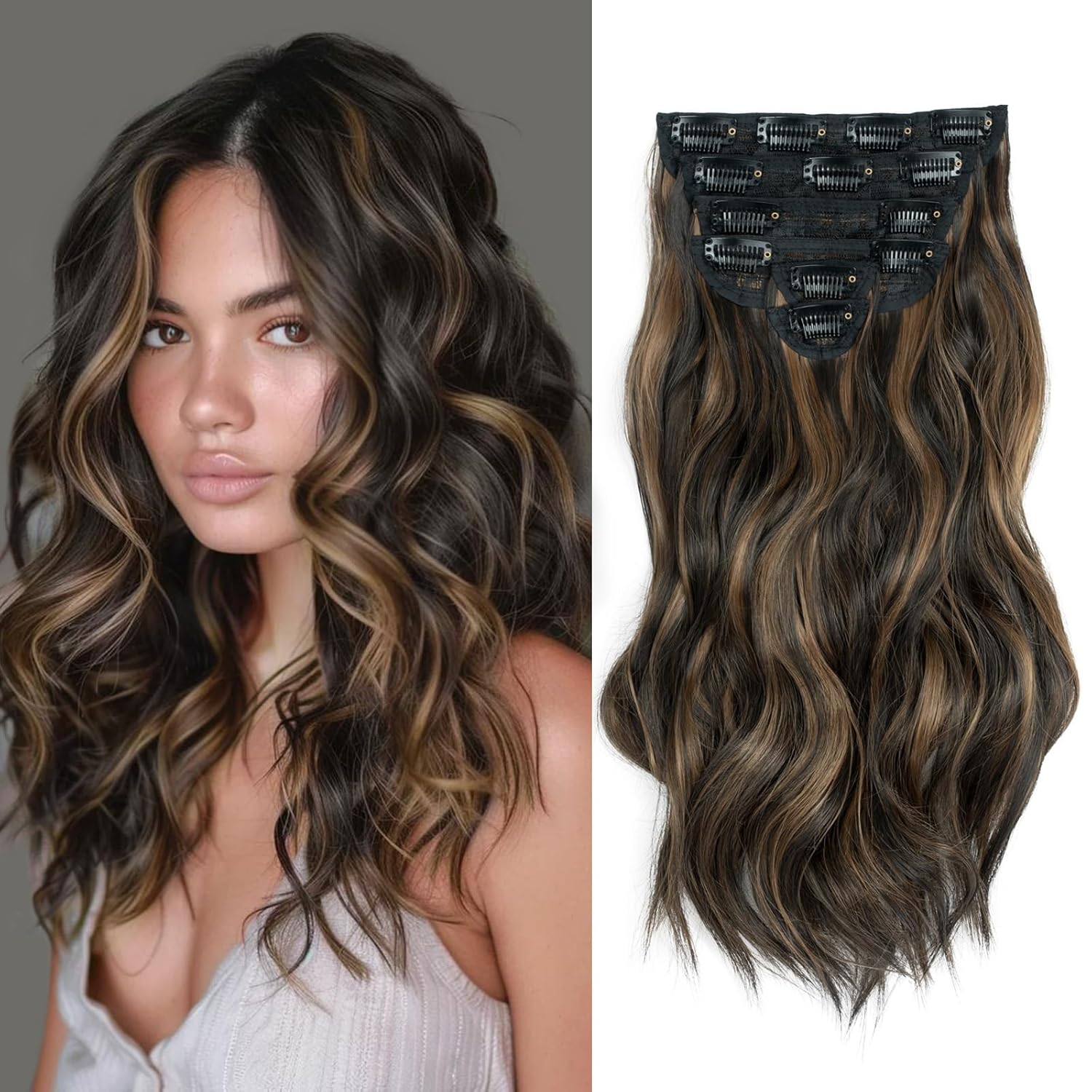 Clip in Long Wavy Synthetic Hair Extensions 16 Inch Black with Caramel Highlights 6PCS Thick Hairpieces Fiber Double Weft Hair for Women