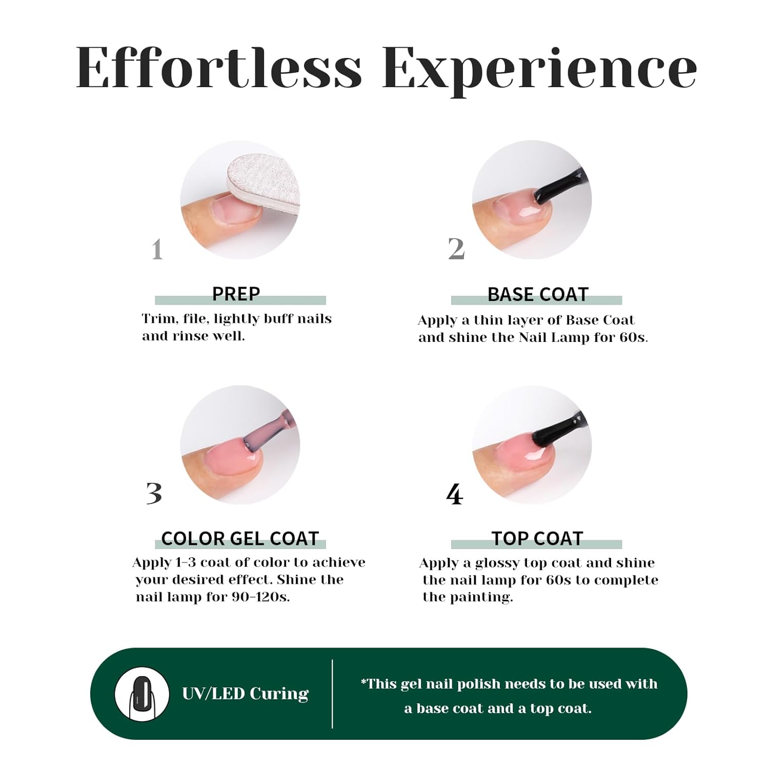 - ๐จSpeed Curing with LED Nail Lamp: The gel nail polish kit need to be cured under LED light. Base and Top coat required. Average for LED light 60-120 secs.