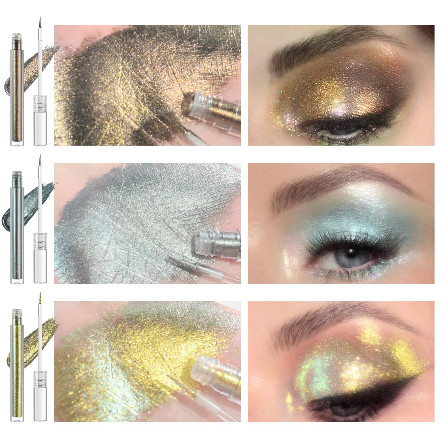 Multichrome Liquid Eyeshadow Set,3 Colors Multi-Dimensional Eye Liner Makeup,High Pigment Waterproof Metallic Eye Shadow,Ultre Fine Tip Glitter Eyeshadow (07 bronzer+08 armor+09 gold)