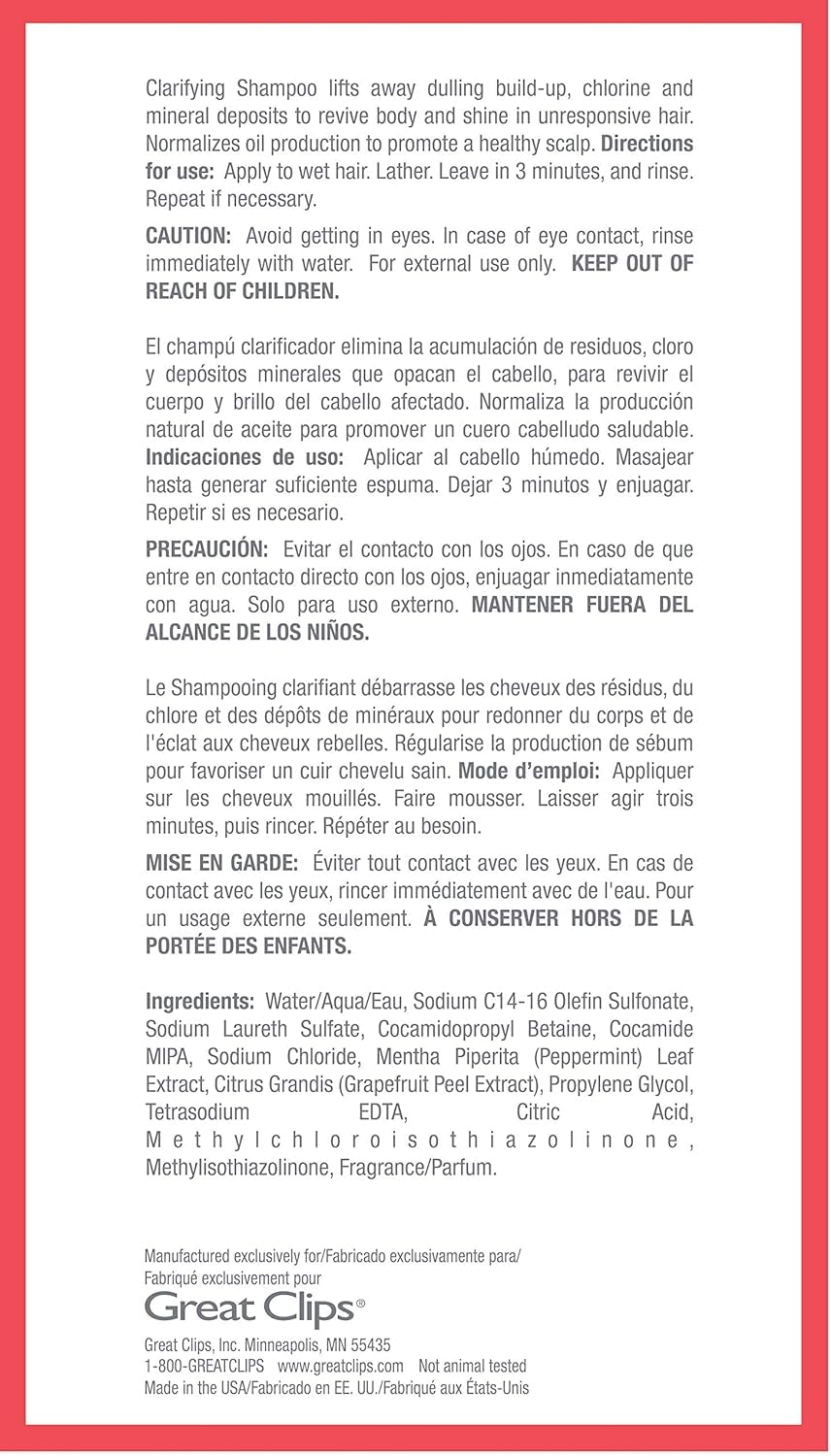 - RECOMMENDED USE: Use our clarifying shampoo by applying to wet hair, lather, leave on for 3-5 minutes and rinse. Use 2-3 times per week in rotation with your favorite Great Clips' shampoo.
