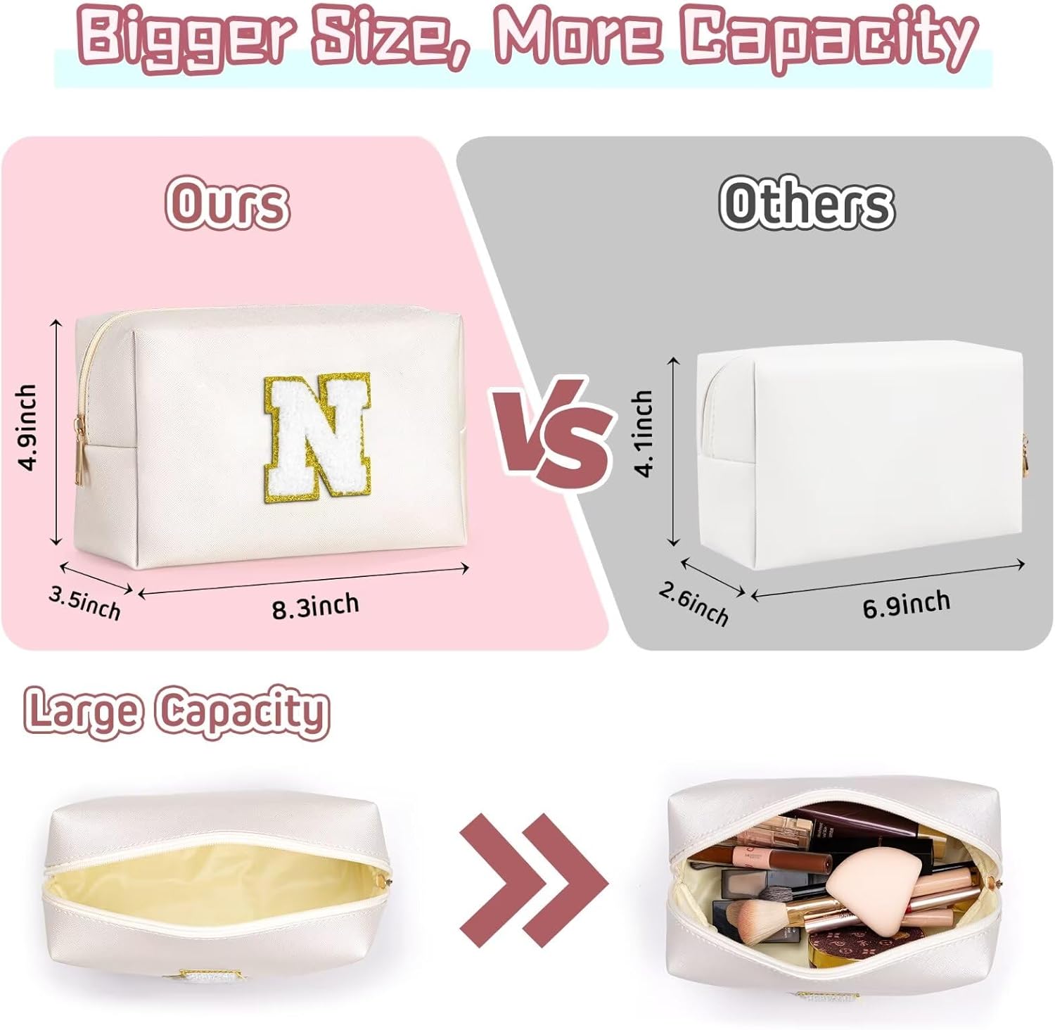 - PERSONALIZED INITIAL PATCH DESIGN: Preppy makeup bag boasts a gold glitter chenille patch that is not only stylish but also skin-friendly and comfortable to touch. The cute monogram patch has a strong personalized style, and it is sewn onto this cute makeup bag to brighten up the look and add a personalized touch