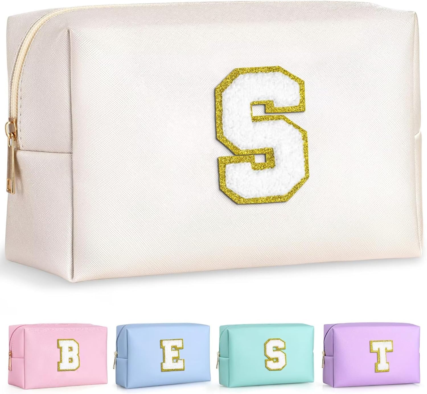 - PERSONALIZED INITIAL PATCH DESIGN: Preppy makeup bag boasts a gold glitter chenille patch that is not only stylish but also skin-friendly and comfortable to touch. The cute monogram patch has a strong personalized style, and it is sewn onto this cute makeup bag to brighten up the look and add a personalized touch