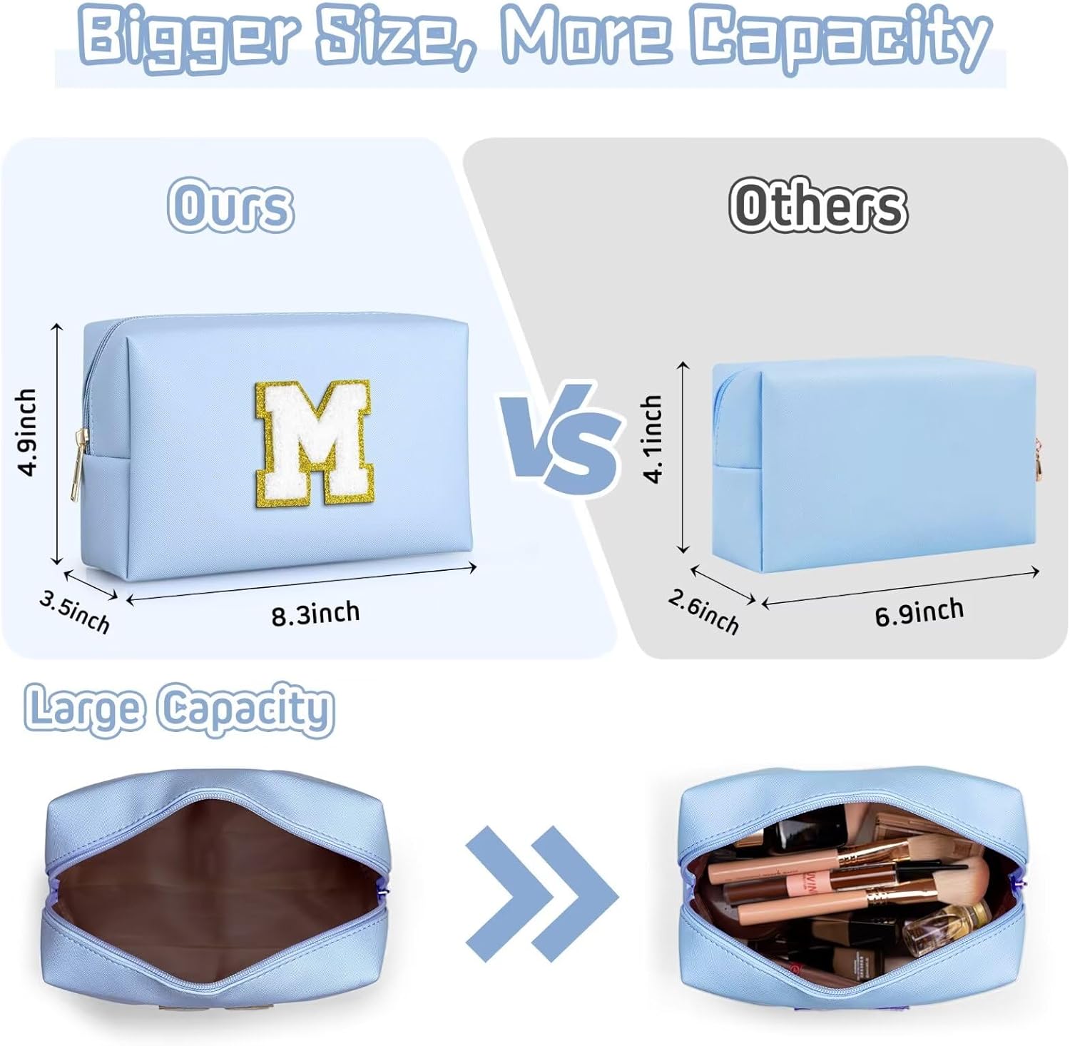- PERSONALIZED INITIAL PATCH DESIGN: Preppy makeup bag boasts a gold glitter chenille patch that is not only stylish but also skin-friendly and comfortable to touch. The cute monogram patch has a strong personalized style, and it is sewn onto this cute makeup bag to brighten up the look and add a personalized touch