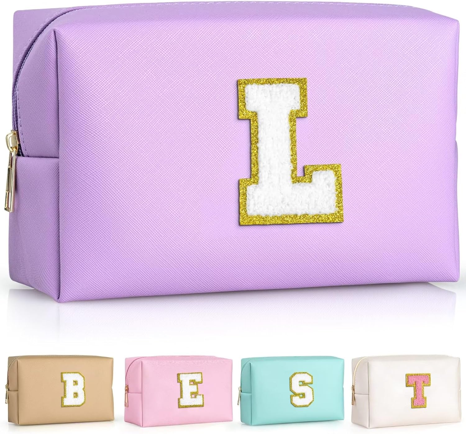- PERSONALIZED INITIAL PATCH DESIGN: Preppy makeup bag boasts a gold glitter chenille patch that is not only stylish but also skin-friendly and comfortable to touch. The cute monogram patch has a strong personalized style, and it is sewn onto this cute makeup bag to brighten up the look and add a personalized touch
