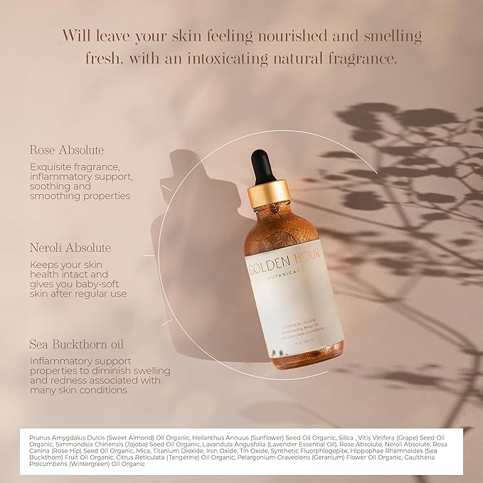 - SHIMMERING GOLDEN GLITTER BODY OIL: This decadent aromatic oil imparts a beautiful golden shimmer for perfectly illuminated hydrated skin. Infused with botanical oils, Ethereal Glow will leave your skin feeling nourished and fresh with an intoxicating natural slightly scented fragrance.