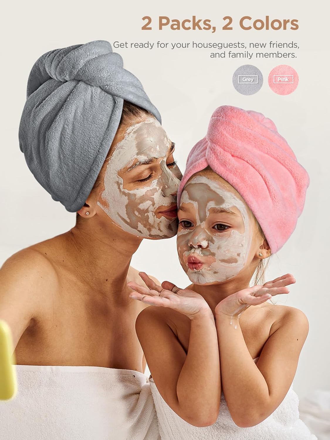 Hicober Microfiber Hair Towel, 2Packs Hair Turbans for Wet Hair, Drying Hair Wrap Towels for Curly Hair Women Anti Frizz(Pink,Grey)