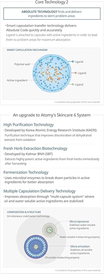 - [An upgrade to Skincare 6 System-1] Fermentation Technology - Uses microbial enzymes to break down particles in active ingredients for better absorption / Multiple Capsulation Delivery Technology - Improves absorption through "multi-capsule system" where oil and water soluble active ingredients are stabilized