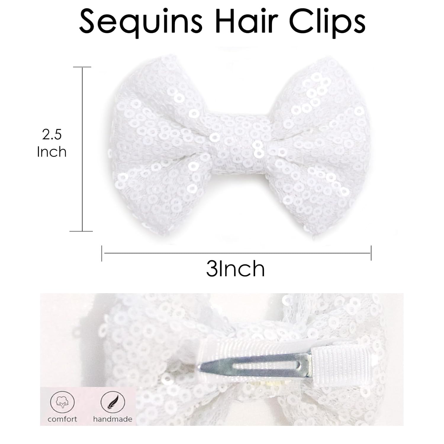 KISZU 3 Inch Glitter Hair Bows Clips, Sparkling Sequin Little Bow HairPins for Baby Girls Children Teens and Women (White)