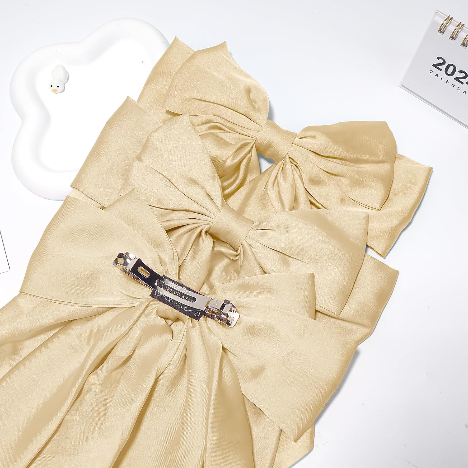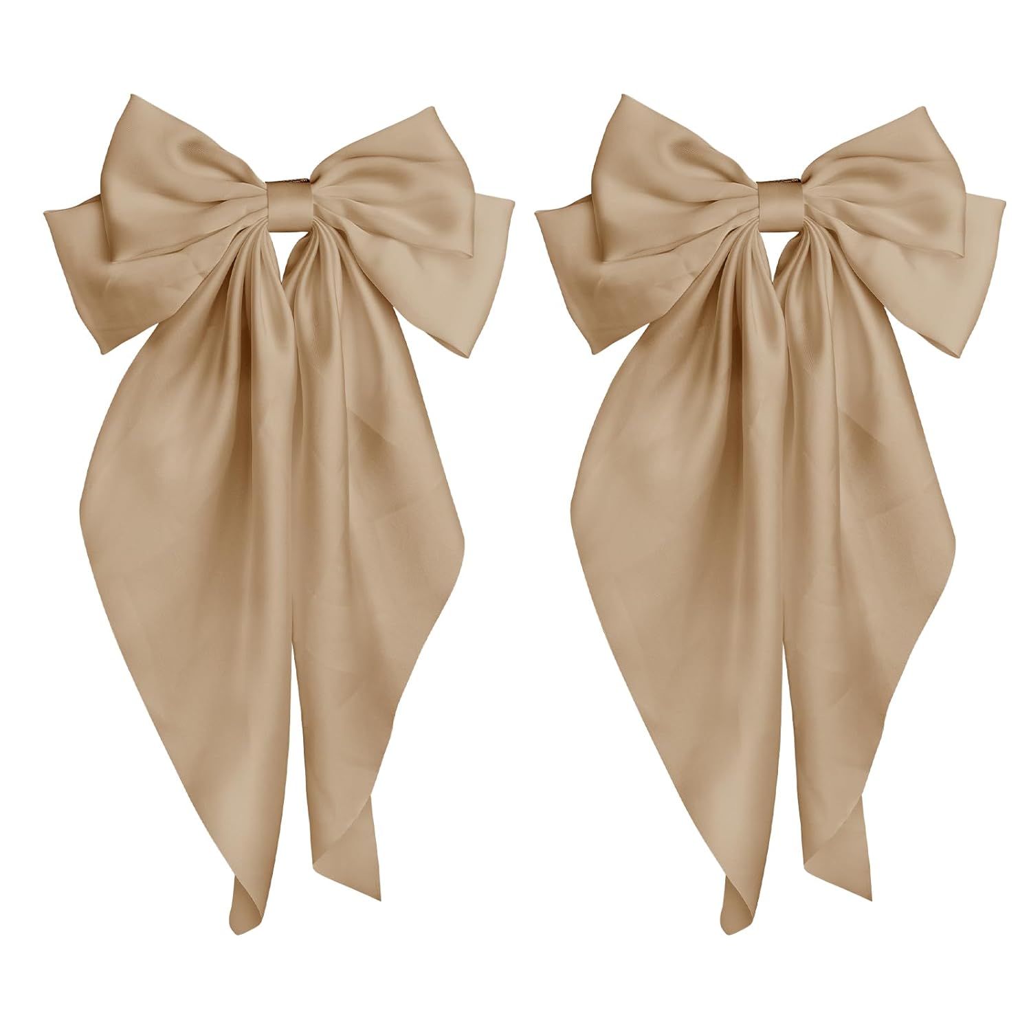 Hair Bows for Women Silky Satin Hair Bow with Long Tail 2PCS Khaki Hair Ribbons Bow Hair Clips Large Hair Bow with Metal Clips