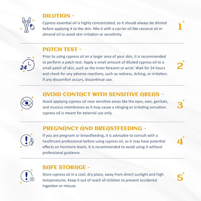 - Safer: Our cypress oil is distilled from the Spanish cypress trees' fresh leaves and berries. Toxin-free, additive-free, unfiltered, and undiluted. Tested for purity and composition by GC/MS, MSDS, COA, IFRA and more
