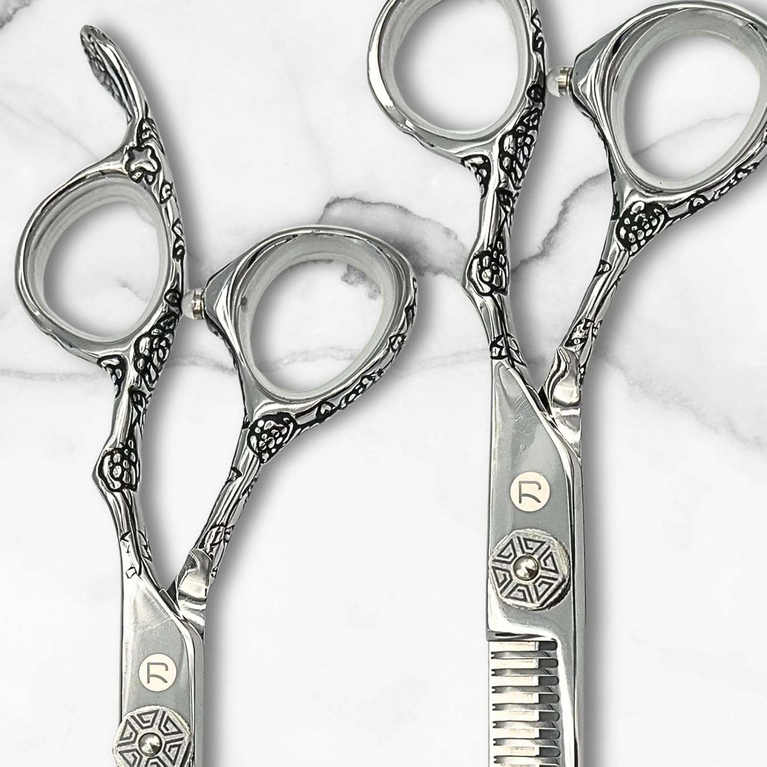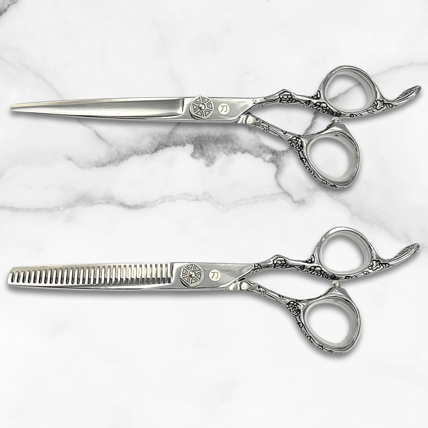 Saki Shears 6 Inch Set of Hair Cutting and Thinning Scissors With Flower Design on Handle and Finger Holes - 440C Stainless Steel - Professional Hair Cutting Set (Silver)