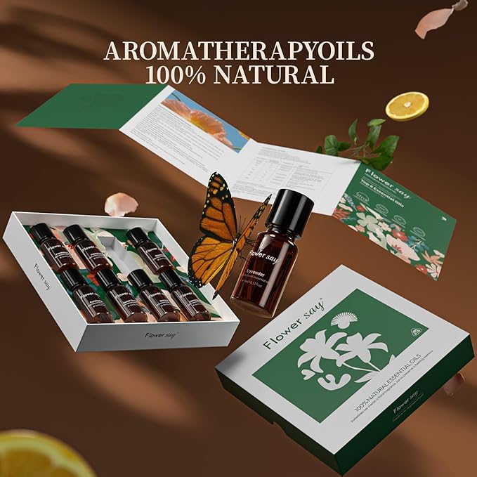- Product Benefits : Natural Relaxation – Create a calming atmosphere for sleep, yoga, or meditation using your diffuser or humidifier., Pure Plant Power – Enjoy 100% pure, steam-distilled essential oils with no additives or synthetic fillers., Everyday Wellness Support – Choose from 8 versatile scents to match your mood, from energizing peppermint to soothing lavender., DIY-Friendly – Ideal for homemade candles, bath bombs, massage blends, or skincare routines (with proper dilution)., Perfect Gift Set – Elegantly boxed and ready for birthdays, holidays, weddings, or housewarmings. Natural Relaxation – Create a calming atmosphere for sleep, yoga, or meditation using your diffuser or humidifier., Pure Plant Power – Enjoy 100% pure, steam-… See more