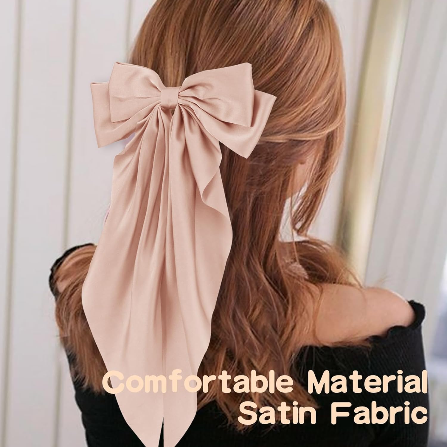 Hair Bows for Women, 6 PCS Silky Satin Hair Clips, Large Bow Hair Barrettes, Oversized Long Tail, Pink Color, Metal Bow Hair Clips, Aesthetic Hair Accessories