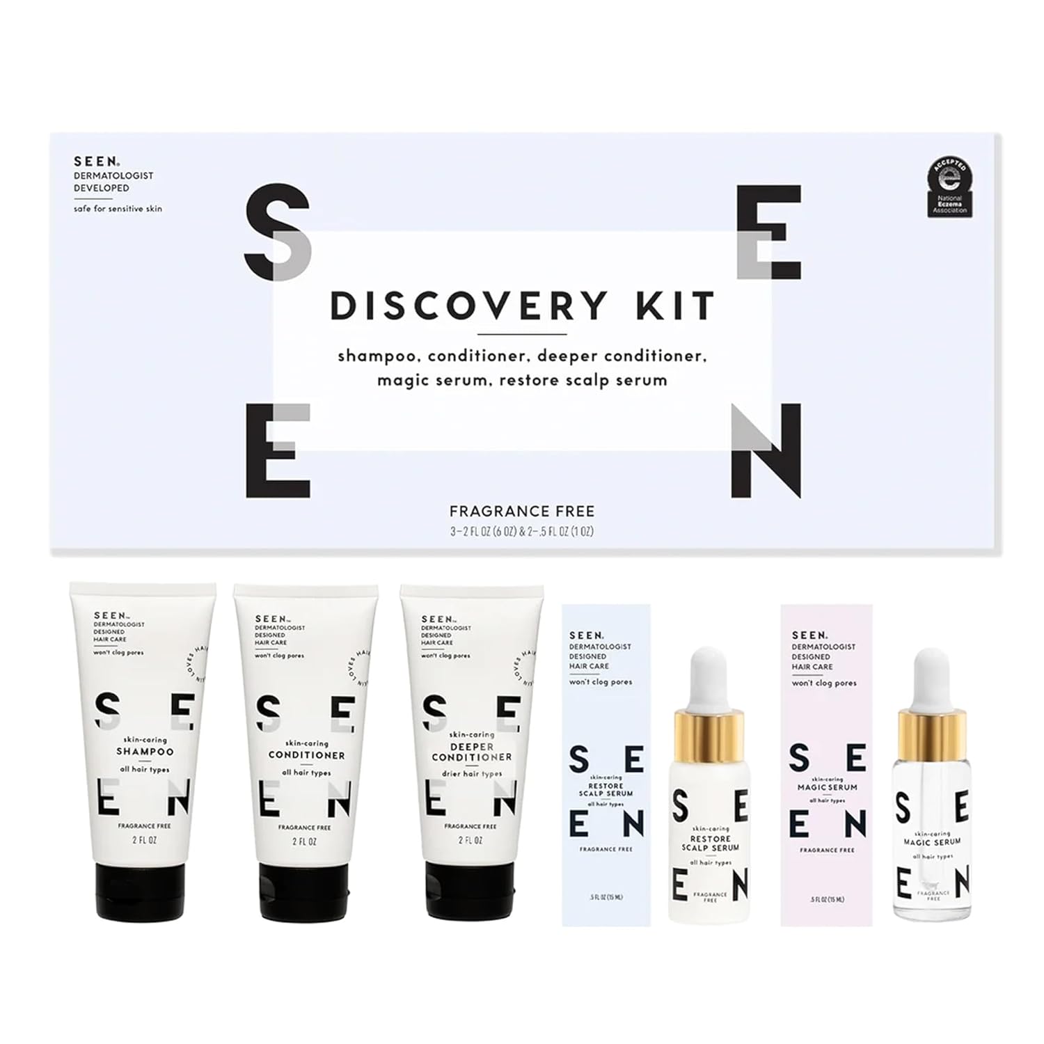 - Discover 5 of our best-selling products. The SEEN Discovery Kit features mini sizes of our fragrance free Shampoo (2 oz.), Conditioner (2 oz.), Deeper Conditioner (2 oz.), Magic Serum (.5 oz.), and Restore Scalp Serum (.5 oz.)