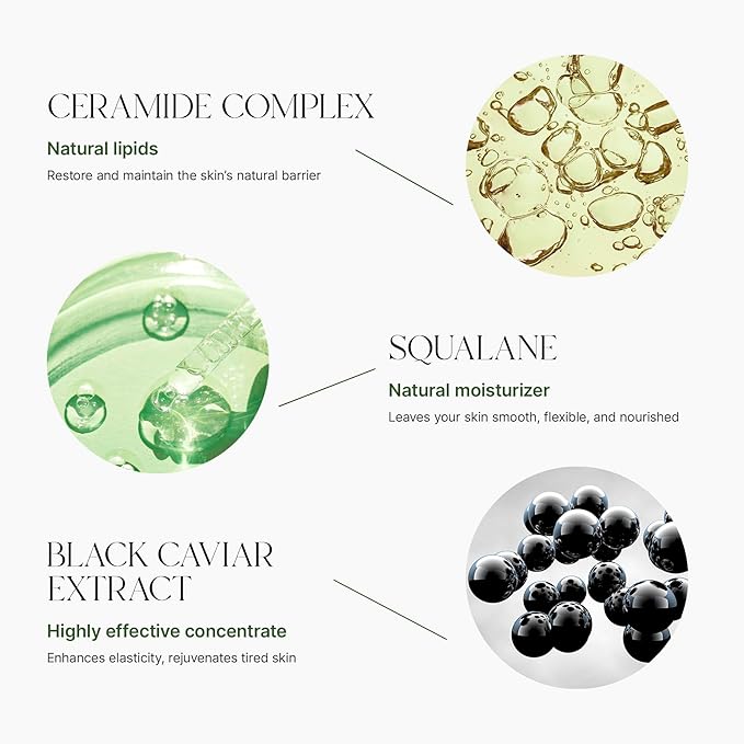 - Moisture Lock Technology: Experience a smoother and softer feel as the serum helps lock in moisture, creating a protective barrier that retains hydration throughout the day for a plump and hydrated complexion. Black Caviar Extract aids in enhancing skin elasticity, rejuvenating tired skin, bringing a touch of luxury to your skincare.