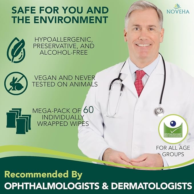 - BACKED BY SCIENCE: Our eyelid wipes undergo meticulous inspection for safety and quality. It’s time to start treating your eyes like they really deserve. Click ‘Add to cart’ and order your NOVEHA Demodex eye wipes TODAY!