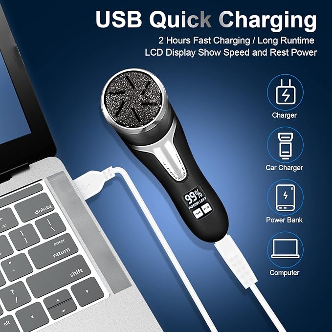 • Rechargeable, Long-Lasting, Easy to Use ----Included USB charging cable, This electric foot file can be charged via any USB port, and have a long runtime 2hours after full charged .and this dead skin remover for feet have LCD Power display let you clear know the rest power it left. remind you charge in time