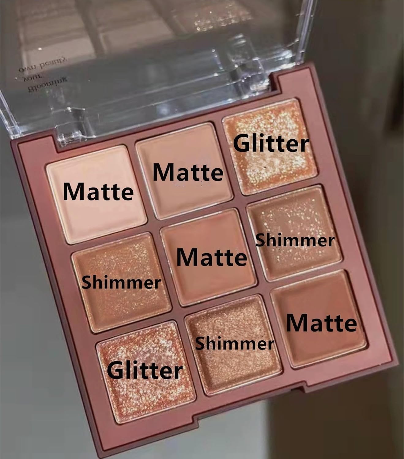 - 【9 Colors Matte&Shimmer&Glitter Neutral Eyeshadow Palette Makeup 】Fine Matte Powder and Glitter-shaped Combination for nude Eye look,make you stand out from the crowd.This eyeshadow palette contains 9 colors shimmer and matte pigments and shades.It would be fun to add the shimmer shades on top of the matte ones, and eyes come out gorgeous, has a glossy look.