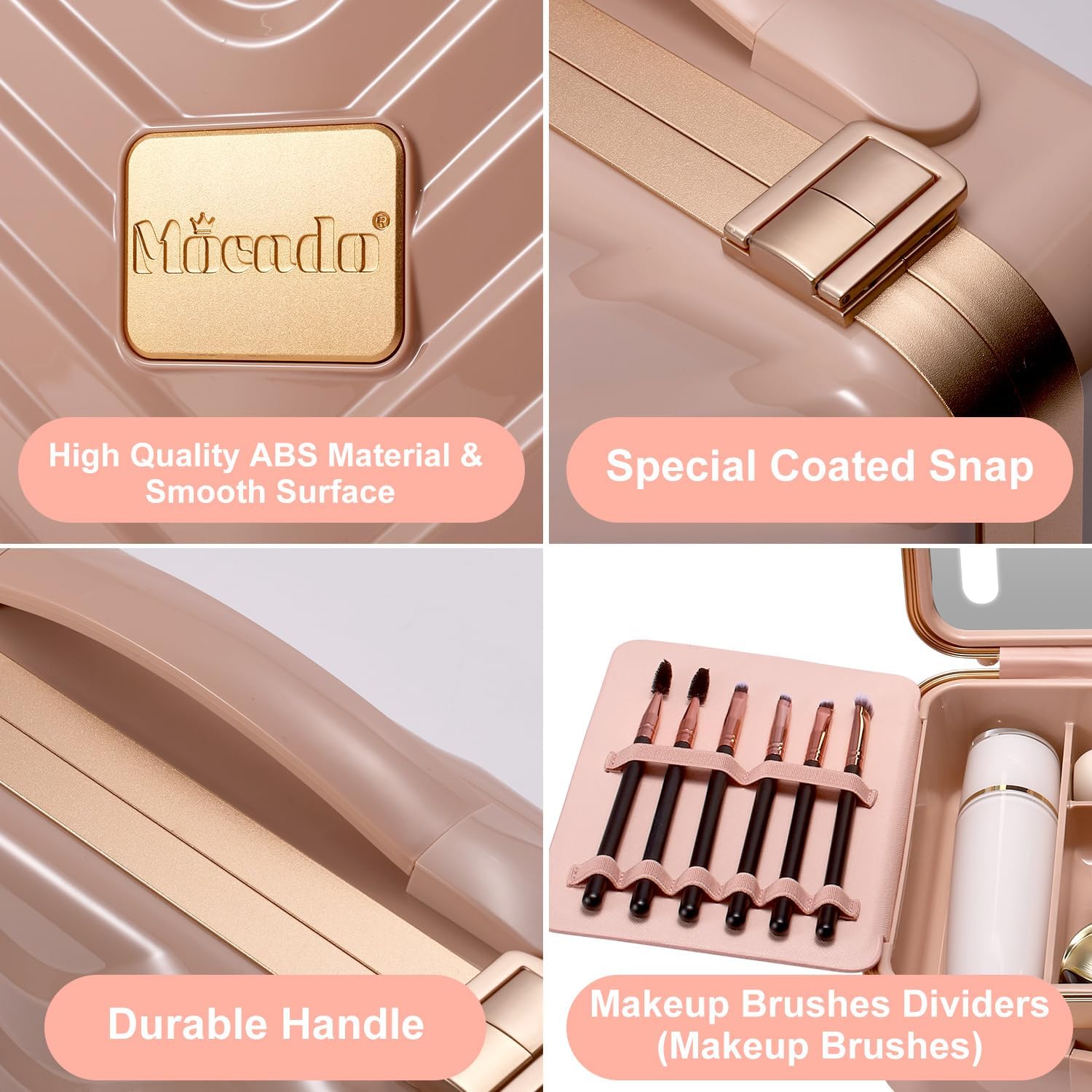 - ๐ใMocado Novel Design Makeup CaseใModern design combination of integrated make-up case and make-up mirror. Storage compartments designed according to commonly used cosmetics, folding dividers for 9 different makeup brushes, HD 6K makeup mirror with adjustable light. Thanks to the large-capacity storage space and compactness, it can meet the make-up needs of travelling or business trips, and is the best travel companion for beauty .
