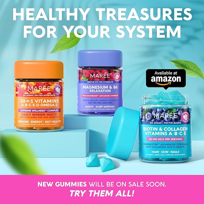 MAREE Vitamin B1 Thiamine & B7 Biotin Gummies - A E D C Vitamins Complex with Keratin, Collagen, Hyaluronic & Pantothenic Acid for Skin, Nails & Hair
