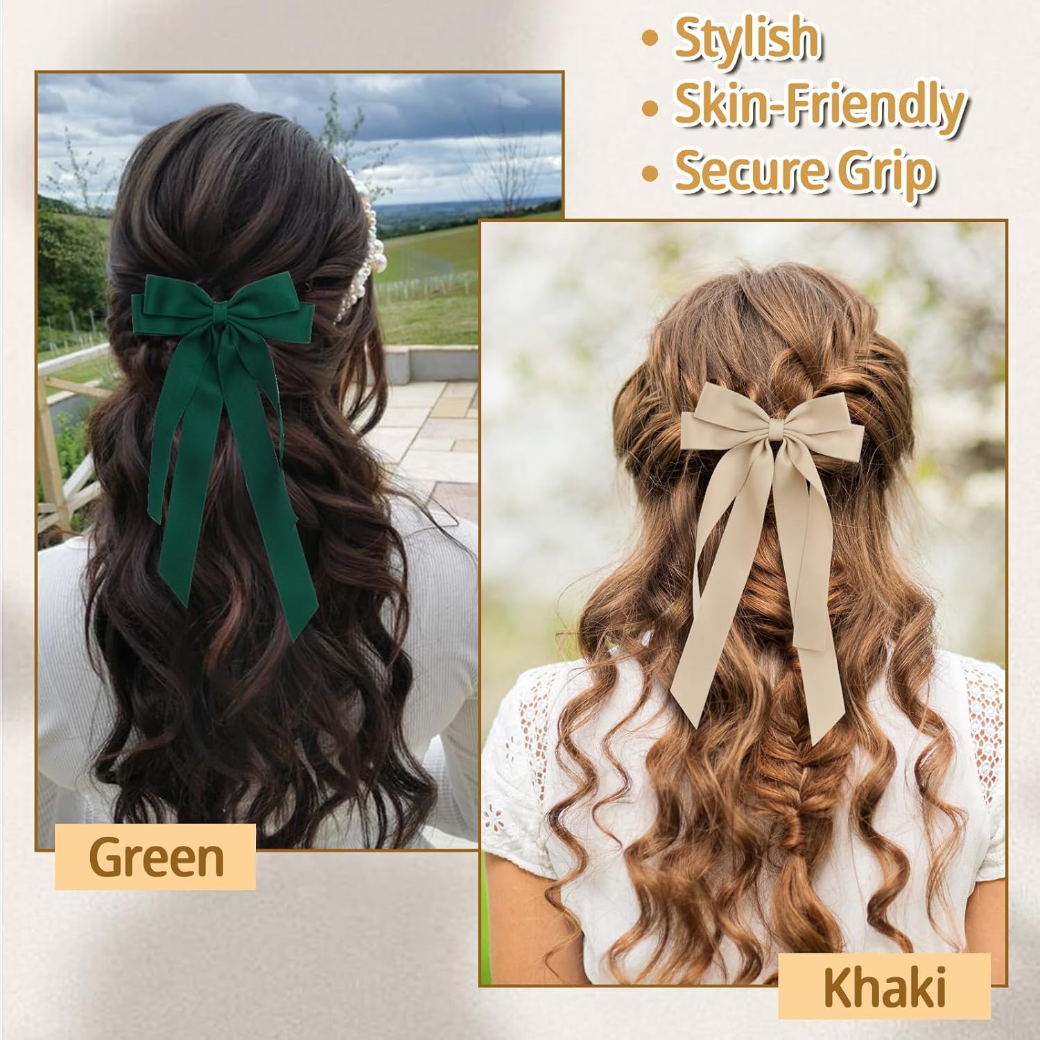Bow Hair Clips 2PCS Set for Women and Girls - Black White Ribbon Bows for Hair, with Long Tail, Alligator Clip (Green & Khaki)