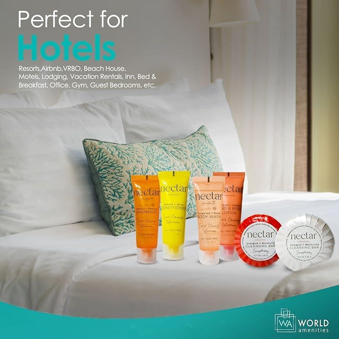 Nectar Mini Travel Size Toiletries Bathroom Kit | Sweet Orange Blossom| Shampoo, Conditioner, Body Wash, Lotion, Two Round Cleansing Bars & Body Bar