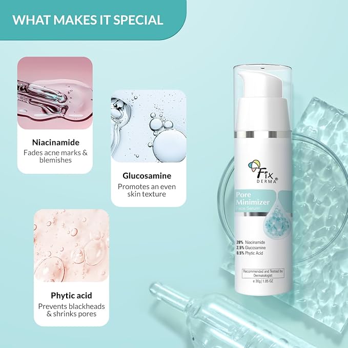 Fixderma 20% Niacinamide Serum for Face for Pore Minimizer with 2.5% Glucosamine & Hyaluronic Acid for Open Pores | Hydrating Serum for Men & Women - 30g
