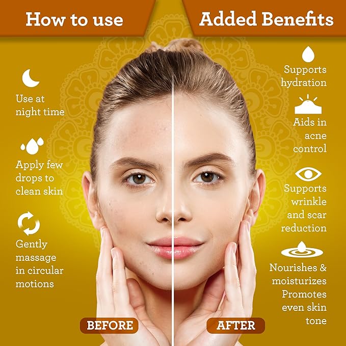 - SKIN NOURISHMENT & RESTORATION: Suited for all skin types, apply a few drops at night on clean skin. Gently massage to promote hydration, and help with acne, wrinkles, and scars, promoting even skin tone while deeply nourishing and moisturizing for a radiant complexion.