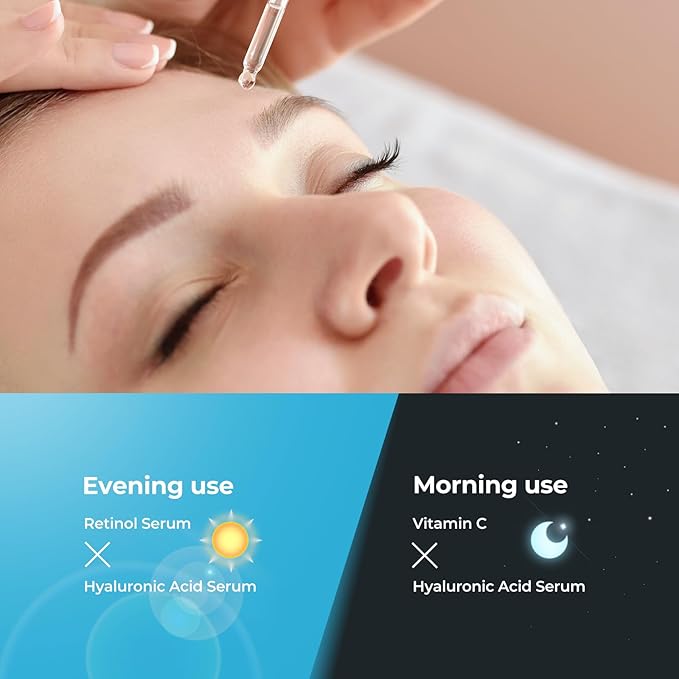 - HOW TO USE: Apply Vitamin C Serum for face in the morning, followed by Hyaluronic Acid Serum. Apply Retinol Serum in the evening, followed by Hyaluronic Acid Serum. Apply 3-5 drops of serum every morning and evening when cleansing skin; for best results, follow with moisturizer. Important Tip: Apply sunscreen daily when using retinol in a skincare routine.