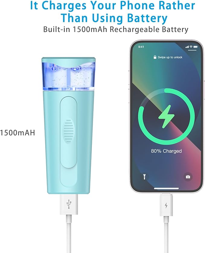 - 【Features】 1. Superfine & strong cool mist keeps the skin feeling refreshed and hydrated. 2. It's compact, easy to carry around or travel with, and great for everyday use. 3. Face mister can charge your phone or watch rather than using batteries. 4. Can be used to relieve redness in the eyes after eyelash extensions. 5. Use the face mister for your skincare and wetting beauty blender. 6. Use face mister to cool down on the hotter summer days