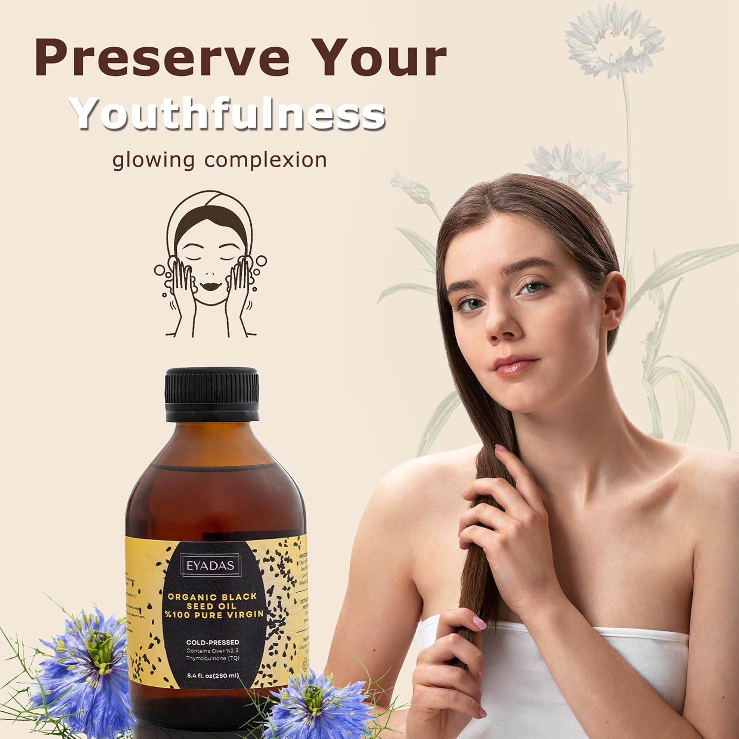 Organic Black Seed Oil 8.4 Fl Oz – 100% Turkish Cold-Pressed Nigella Sativa with 3X Thymoquinone – Pure Cumin Extract in Amber Glass Bottle for Immune, Hair, Skin & Overall Wellness