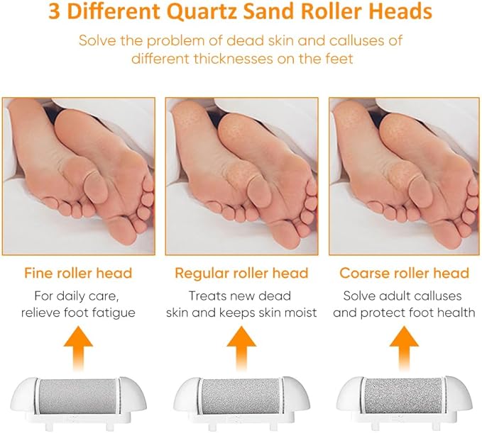 - ๐ฏ 3 Quartz Roller Heads ๐ฏ 3 varying roller heads: Light Callus Roller suitable for daily foot care, Regular Callus Roller suitable for non serious dead skin and calluses. Heavy Callus Roller suit for stubborn dead skin, You can choose suitable roller head according to the situation of your foot.